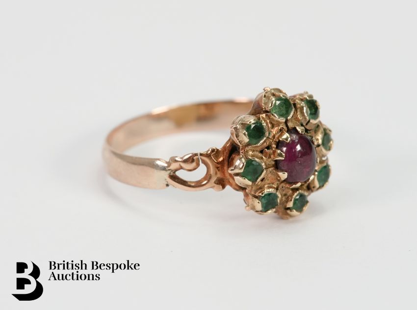 An antique 9ct yellow gold emerald and ruby ring, set with a 5 x 4mm ruby and 8 x 2mm emeralds, size O+, approx. 2.7gms.