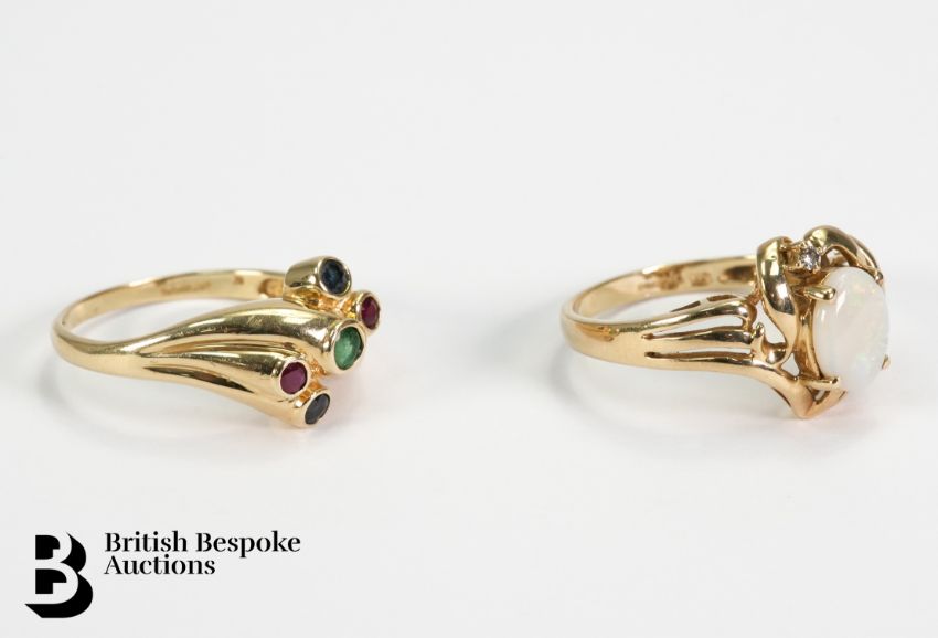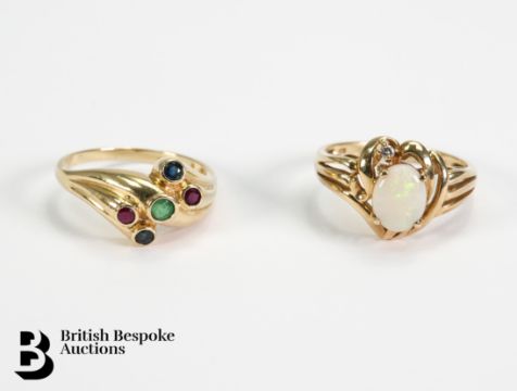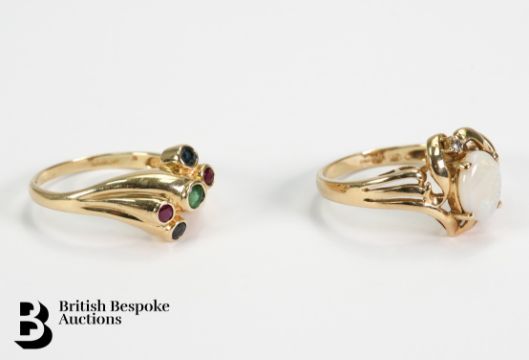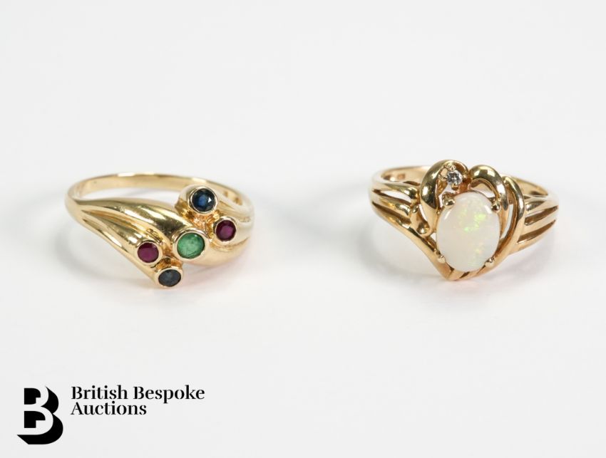 9ct emerald, ruby and sapphire stone ring, size R, 3.69 gms together with a 9ct opal and diamond ring, size R, the opal measures 9 x 7 mm, total weight 3.61 gms.
