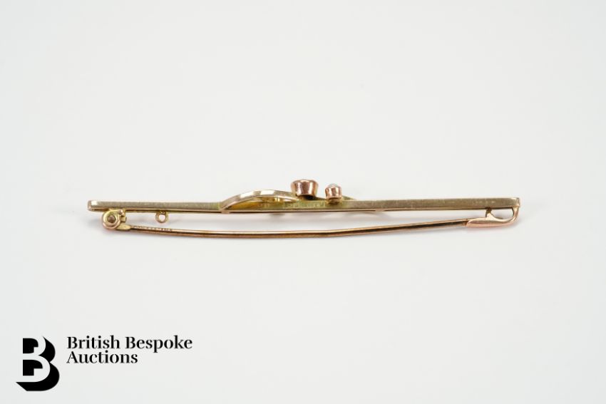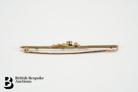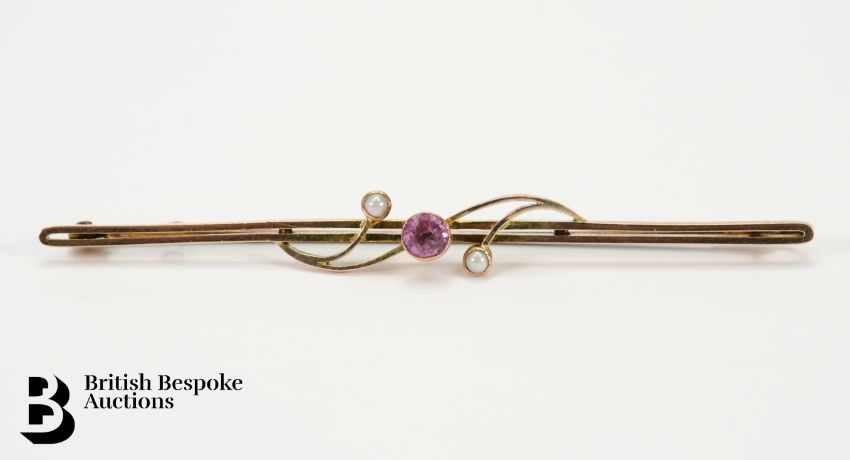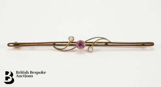 9ct gold bar brooch, applied with a round faceted pink stone, approx. 65.2mm x 1.67mm, approx. 2.55 gms.