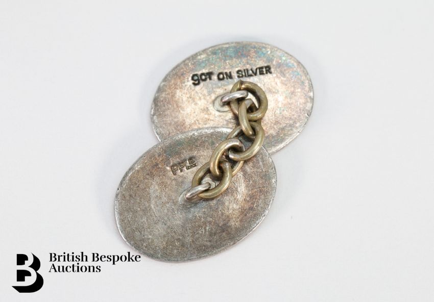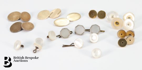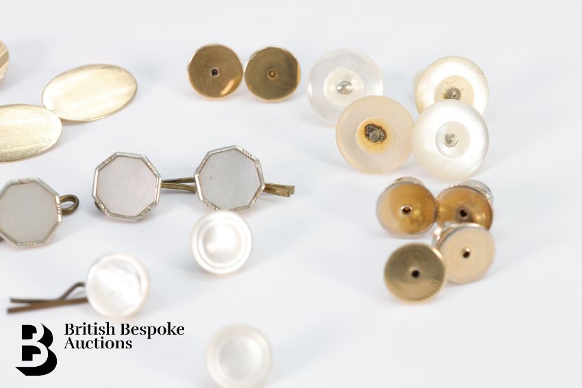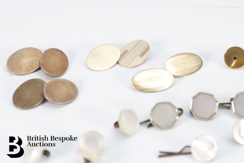 Unpaired 9ct gold cuff links, one is London dated 1968, and the other Birmingham dated 1944, 6.08 gms; a pair of silver cufflinks, stamped 925, mm PP Ltd together with a quantity of dress studs including mother of pearl.