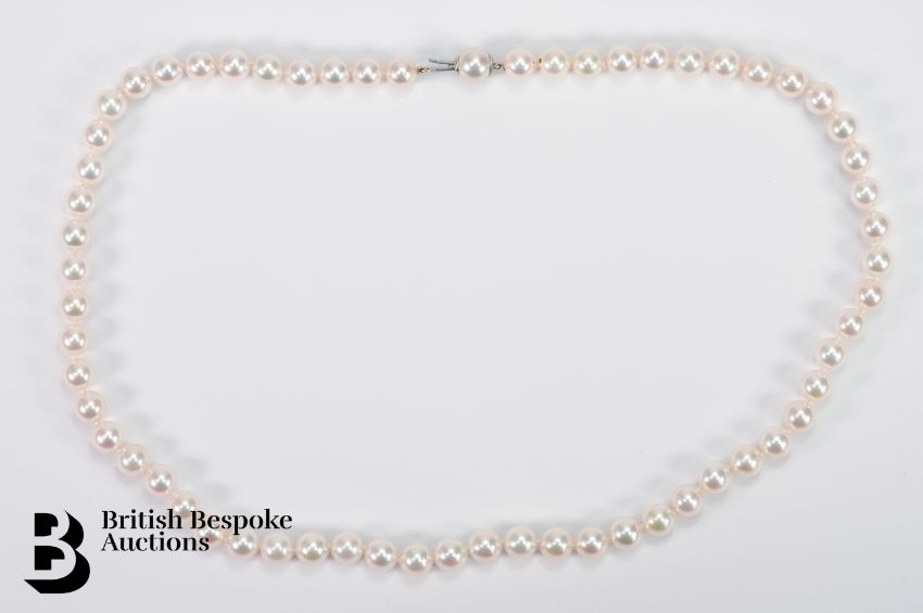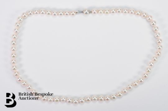 A single row of creamy pink cultured pearls, each pearl approx. 7.5mm, approx. 49 cms, with the original valuation certificate.