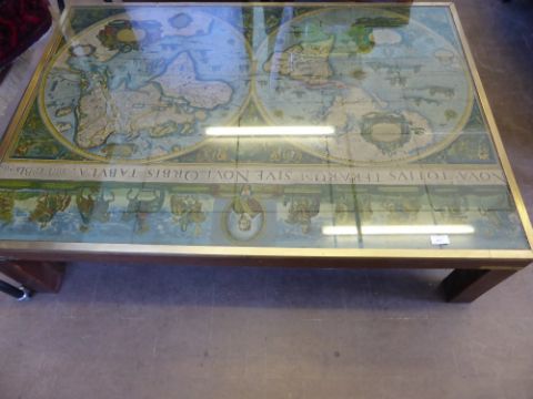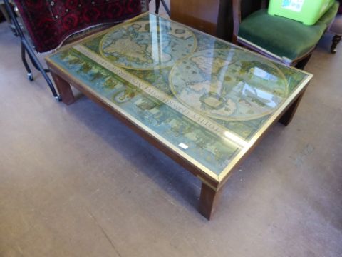 A Brass and Glass Coffee Table, with antique globes inserts with Latin inscription, approx 133 x 96 x 36 cms