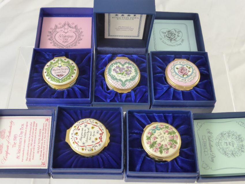 Five Halcyon Days Enamel Valentine Boxes, including 1979, 1980, 1981, 1982, 1983 in the original boxes with certificates.