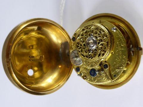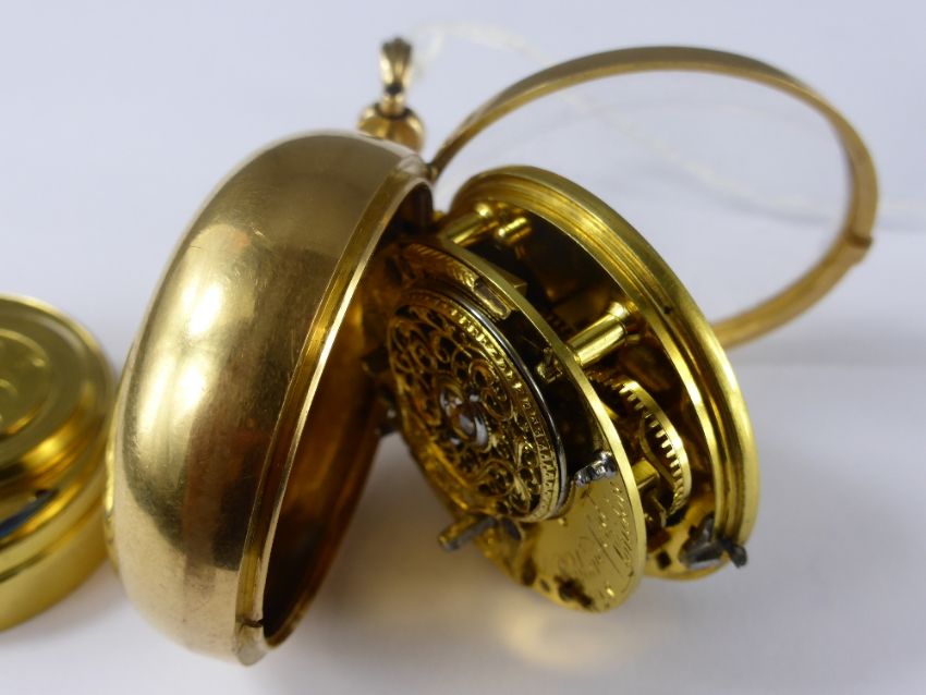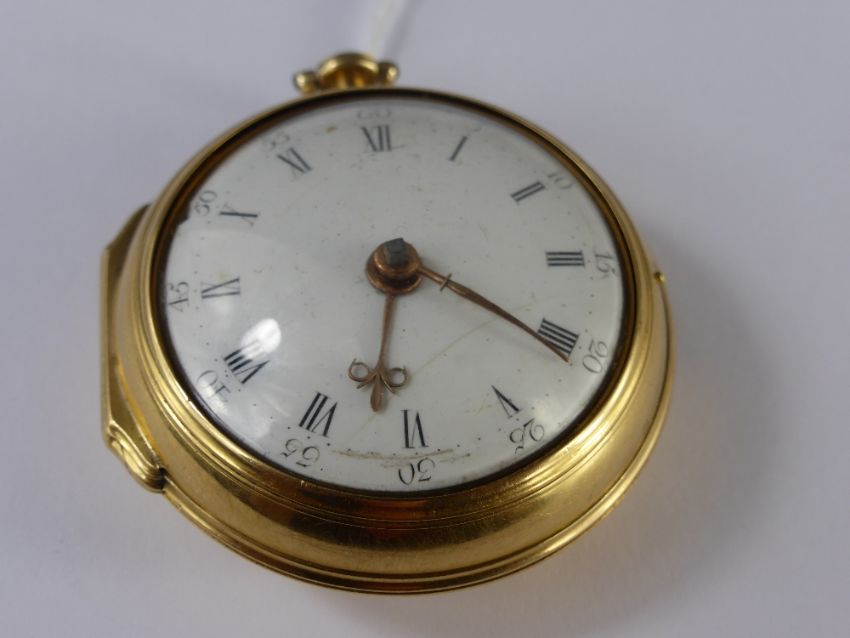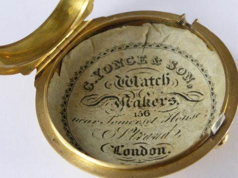 Circa 1800 G Yonge & Son A Gentleman's High Carat Yellow Gold Pair Cased Fusee Pocket Watch, the watch numbered 1428, London hallmark case m.m JC, the pillared movement having adjustment wheel and diamond end stone, inscribed D P Blandford London with gilded dust cover also inscribed D P Blandford London. The watch having a white enamel face with Roman and numeric dial with gold hands. The case containing paper disk G. Yonge & Sons Watch Makers 156 The Strand London 1821. Provenance: From a collection belonging to a direct descendant of Sir Richard King, 2nd Bart (Commander of HMS Achilles at Trafalgar) and his father-in-law Admiral Sir Charles Cotton 5th Bart (of Madingley), Commander of the Channel Fleet 1811.