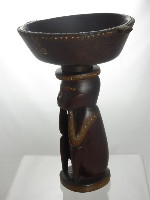 An Antique South Seas Hardwood Carving of a Monkey, depicted seated on its haunches, having decorative carving to arms and legs with a bowl resting on the top, with decorative handles approx 33 cms Provenance: During the late 19th Century Reverend Arthur Henry Scrivin worked as a Methodist missionary for forty years amongst the Pacific Islanders, including Tonga, New Guinea, Fiji, Solomon Islands amongst others.