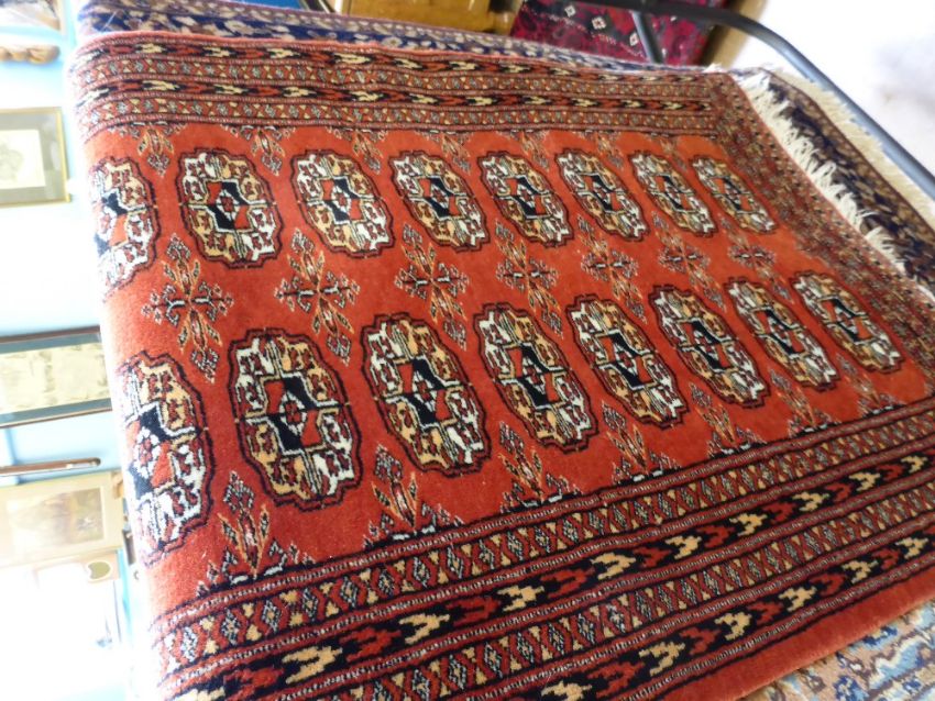 A Middle Eastern Woollen Hall Rug, having central ghoul with brick red background, 65 x 93 cms together with a hand made Iranian Balouch rug, the rug having black, red and purple colouring with central ghoul and floral border, 192 x 104 cms.