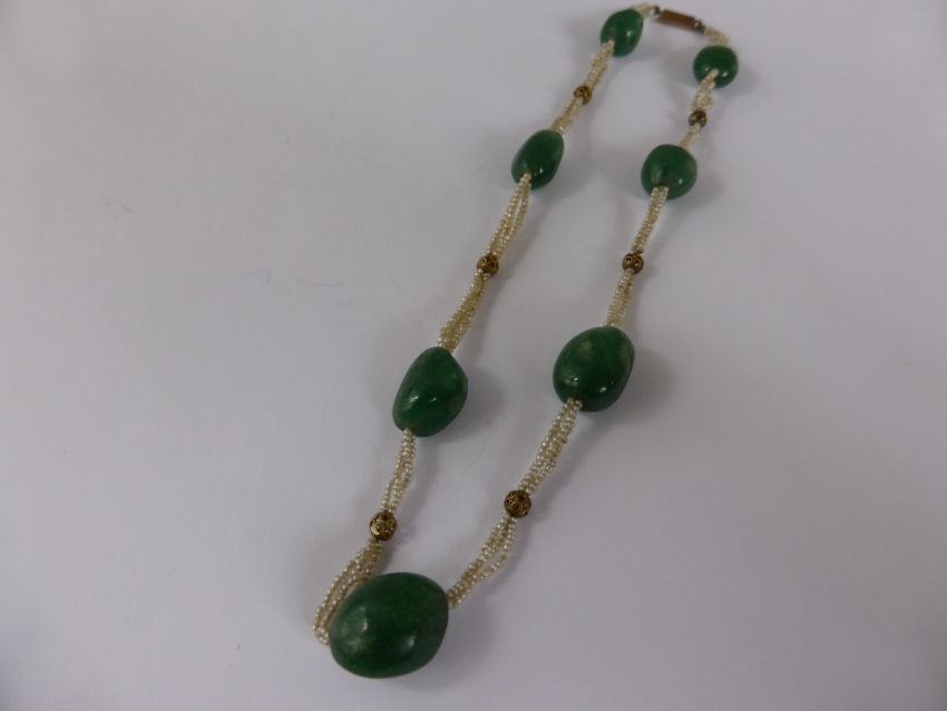 An Antique Green Stone and Seed Pearl Necklet, on gold barrel clasp.