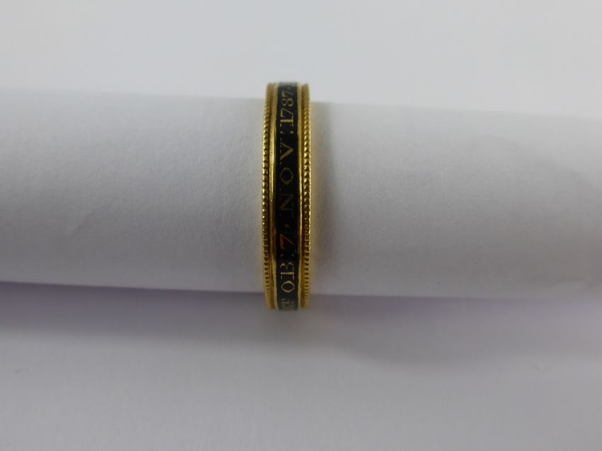 A Georgian High Carat Gold and Black Enamel Mourning Ring, inscription Sr Tho Hatton Bart ob 7 nov 1787 ae 60, the ring having a fine beaded edge, size O approx 4 gms, Lion Passant, m.m MG Provenance: From a collection belonging to a direct descendant of Sir Richard King, 2nd Bart (Commander of HMS Achilles at Trafalgar) and his father-in-law Sir Charles Cotton 5th Bart (of Madingley), Commander of the Channel Fleet 1811. Sir Thomas Hatton (born 14 September 1728) 8th Baronet of Longstanton near Cambridge, a few miles from Madingley. He married Harriet Askham, Daughter of Frances and Dingley Askham.