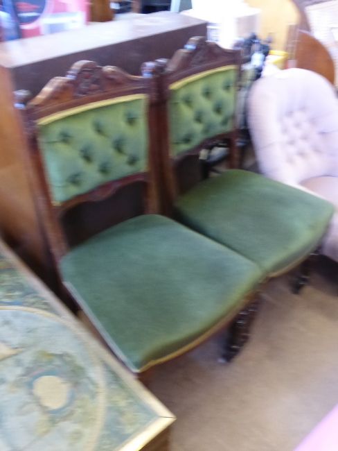 Two Velvet Covered Edwardian Mahogany Salon Chairs, the chairs carved with fruit on turned feet (2).
