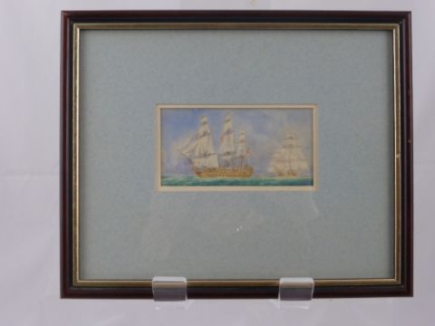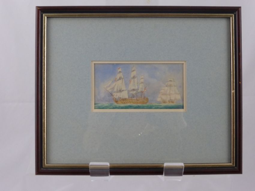 Bevan, Irwin John David, (British) 1852-1940, two watercolours depicting maritime battles, each watercolour with a handwritten excerpt to verso from James's Naval History explaining each event depicted. The first depicting the HMS Royal George, Admiral Sir Edward Hawke in pursuit of the French fleet. The second work is untitled and has no label to verso. 12.5 x 6.5 cms, both framed and glazed.