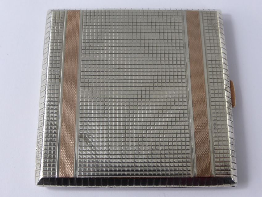 A Lady's Solid Silver and Gold Banded Compact, Birmingham hallmark, H.K dated 1949, approx 160 gms