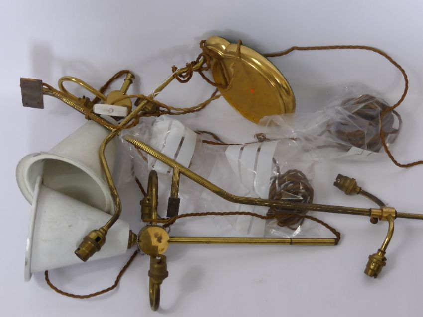 A Quantity of Vintage Continental Brass Light Fittings, including two twin branch wall sconces, two desk lamps and two ceiling lights. (6)