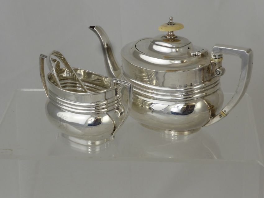 A Solid Silver Bachelor Tea Pot and Sugar Bowl, Birmingham hallmark, dated 1902, m.m L & S, the tea pot with ivory finial both pot and bowl have the monogram H together with a pair of silver sugar nips dated 1971, m.m FH, approx 494 gms