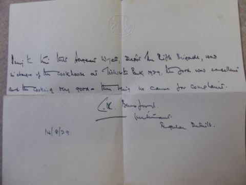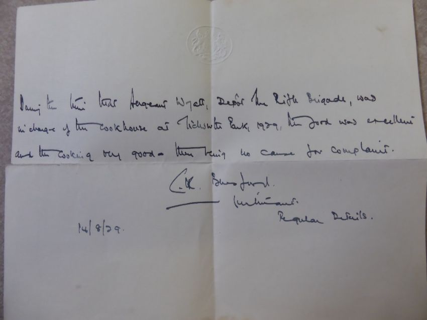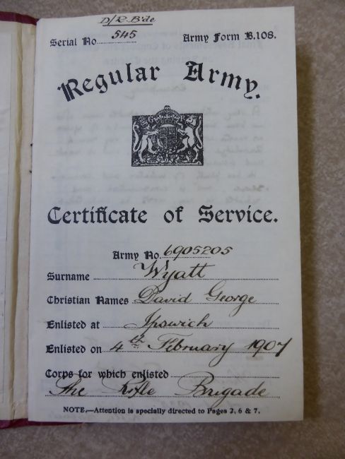 A Group of WWI Medals awarded to 6905205 SJT D.G Wyatt Rifle Brigade, including 1914-15 Star, 1914-1919 Great War medal, George V For Long Service and Good Conduct and the George V Bravery in the Field. (5) together with photographs, letters home (moving), Soldiers Service and Pay book, Certificate of Service, Copy of the East Anglian newspaper with the Army Promotions, various silk postcards, extra ribbon, together with a 42nd Infantry Brigade Rifle Eight Sgt D Wyatt June 1917 ID pendant in the original box, together with his American style oak arm chair.