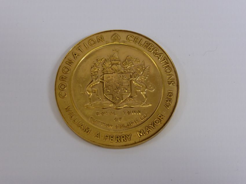 A Gilded Commemorative Medal, Coronation celebration 1937, royal town of Sutton Coldfield, William A. Perry, Mayor.