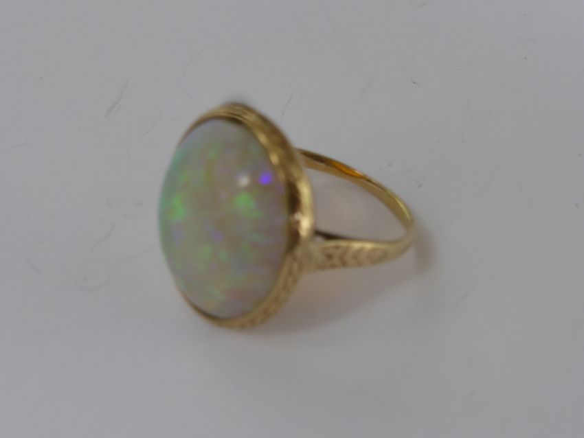 A Lady's Antique 14 ct Opal Ring, the opal is 18 x 16 mm, size N, approx 4.5 gms.