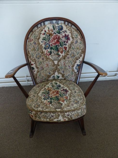 An Ercol Rocking Chair in the Windsor Style, with floral embroidered back and seat.