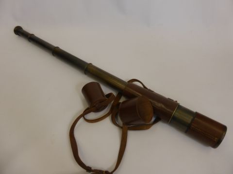 A Late 19th Century Four Draw Brass Sporting Telescope, by Broadhurst Clarkson & Co., 63 Farringdon Road, London E.C.3., original leather covering and leather end caps and straps, 12 inches closed length, 34 inches extended.