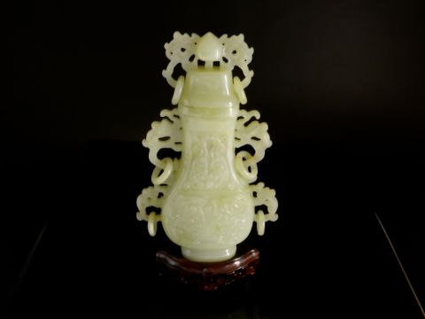 Chinese 20th Century Pale Celadon Jade Vase and Cover, the flattened pear shaped vase decorated in shallow relief with dragons. Double pierced stylized dragon handles with loose rings complimenting the cover. The vase supported on a stepped oval foot. 21 cms (8.5") h.