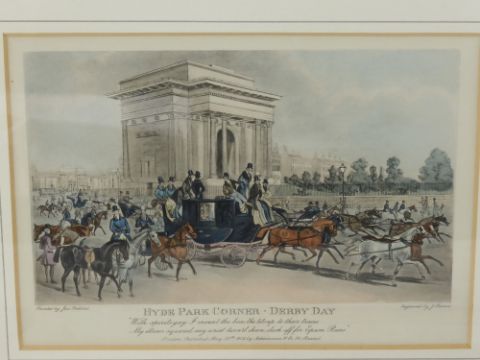 Four Coloured Engravings by J Harris, entitled 'Hard Park Corner-Derby Day', 'Meet of the Four-in-Hand Club', 'The Birmingham Tally-Ho Coaches', 'Leeds Royal Mail Coaches Saluting-Half Way', framed and glazed in Hogarth frames.