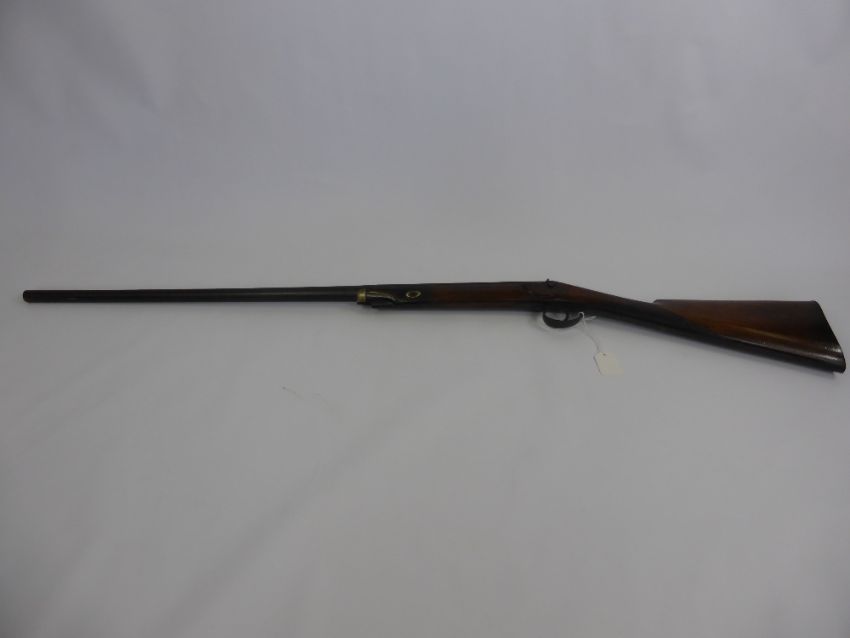 An Antique 14 Bore Back Action Single Barrel Percussion Shot Gun, Birmingham made, re-browned Damascus barrel, minus ramrod, slight distress to forend forward of lock, circa 1840, approx 84 cms