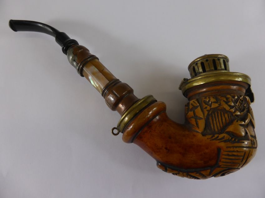 An Antique Meerschaum Pipe, the pipe having the bowl carved with a leaping rabbit, mother of pearl inlaid stem.