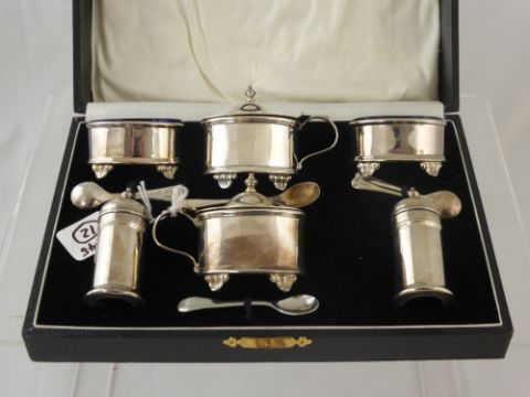 A Sterling Silver Cruet comprising mustard (original blue liner), salts (original blue liners) and peppers with four spoons, Birmingham hallmark dated 1923/33, m.m Adie Brothers Birmingham.
