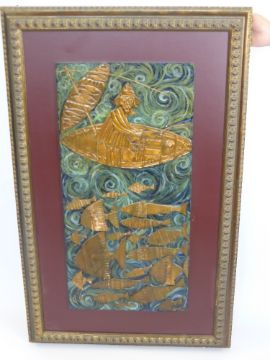 A Unique Hand Pressed Copper Panel, depicting a fisherman and his catch, approx 86 x 42 cms.