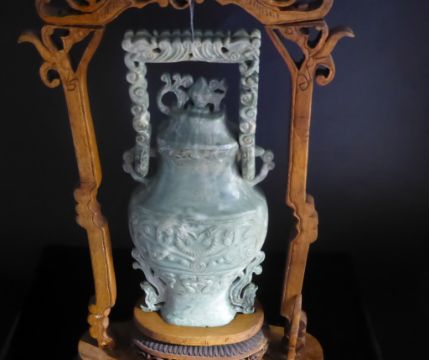 Chinese 20th Century Green and White Jade Suspended Vase, the vase of baluster form having deep green and white inclusions with the centre carved in shallow relief with dragons entwined. The whole suspended from a natural carved wooden base 23 cms (9"). The Jade hanging 27 cms (10.5").and the stand 45 cms (17.5").