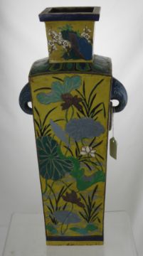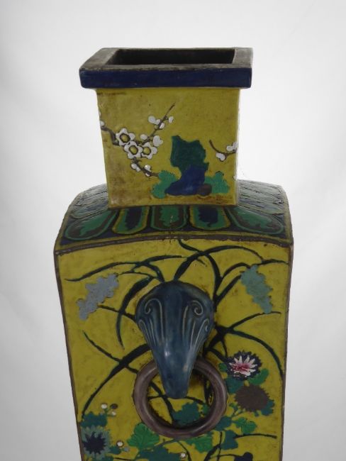 A Chinese Yellow Glaze Ceramic Pillar Vase, the vase painted with lily, blossom and peony benefiting from decorative sea serpent handles, circa 1900, approx 59 cms
