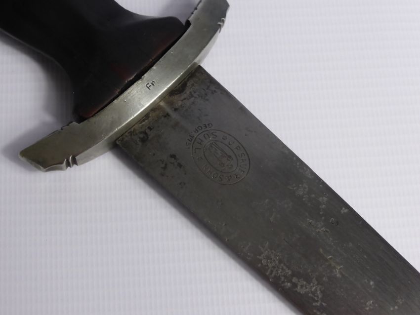 A WWII German SA Dagger, battlefield find, maker JP Souer & Sohn of Suhl also marked GER 1751 and FR on the hilt.