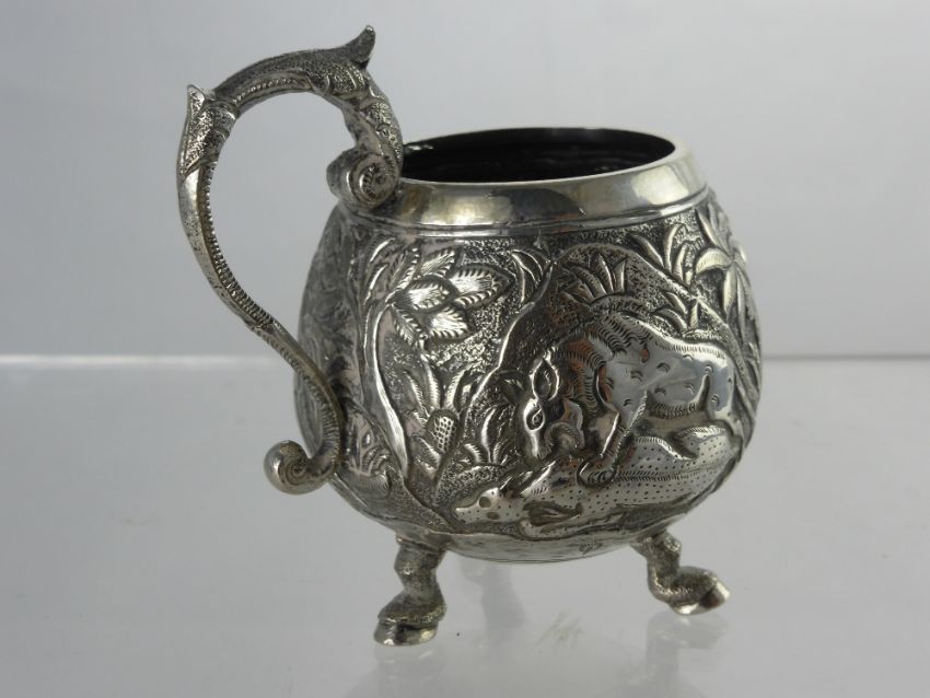 An Antique Indian Silver Handled Tri-footed Cup, chased with a hunting scene, approx 80 gms
