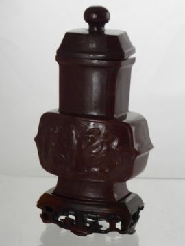 A Red hard Stone Vase and cover having taotie carving in relief to back and front approx 13.5 cms.
