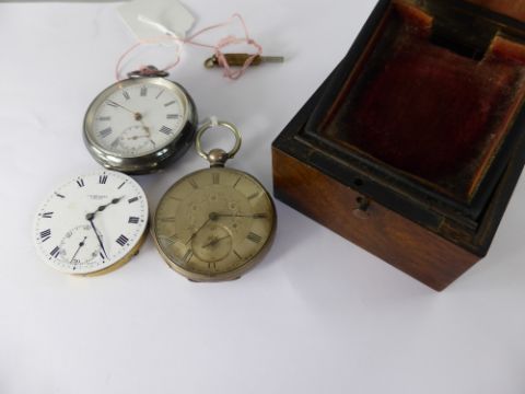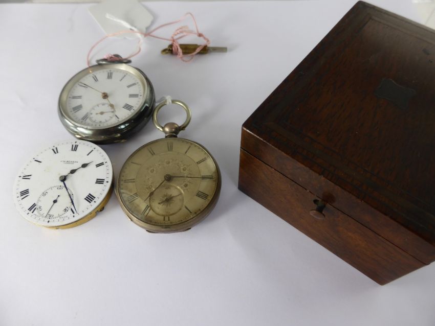 Miscellaneous Silver Pocket Watches, including two Continental Half Hunters, one with silvered face and the other with white enamel dial, together with a JW Benson movement and a rosewood and silver inlaid travelling watch box.