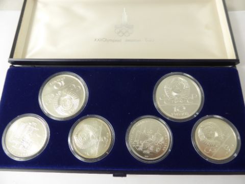 A XXII Olympiad Moscow 1980 Silver Proof Presentation Coin Set, approx 140 gms together with a silver 1914 half-crown brooch. (2)