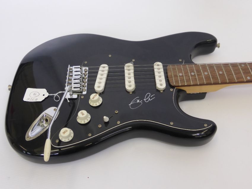 A Black Fender "Squier" Guitar signed by Eric Clapton.