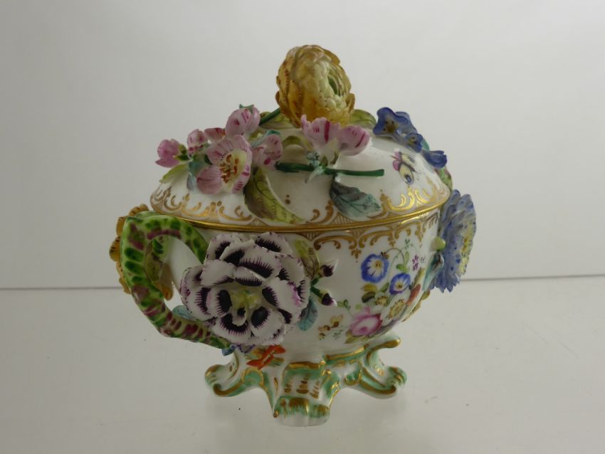 A Meissen Style Twin Handle Sugar Bowl and Cover, hand painted with butterflies and flower spray with applied flowers.