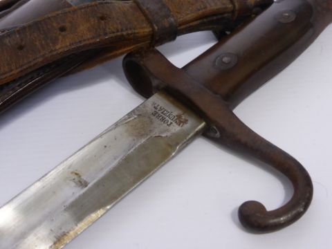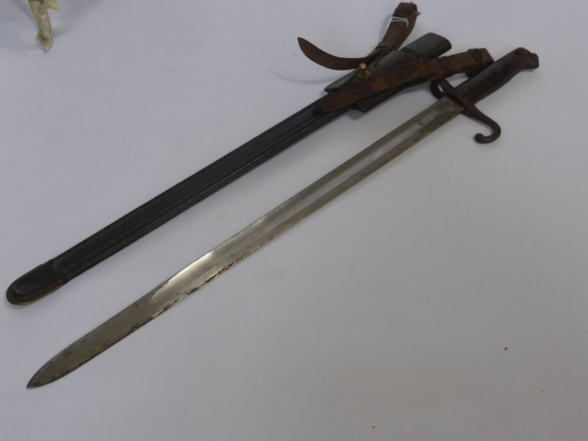 A WW1 Model 1871 Bayonet, Italy Torre Annunziata Bayonet stamped UY24, one side of the blade stamped 'BL', leather scabbard and leather frog, blade measures approx 52 cms.