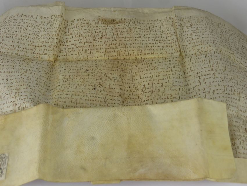 A Vellum Will & Testament for an Ann Claxham of Utlay, dd 1702 with the original wax seal.