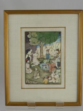 A Persian Painting on Bone, depicting the "Prodigal Sons Return", approx 18 x 12 cms, framed and glazed.