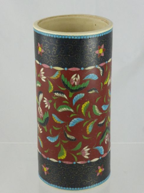 An Oriental Cylindrical Vase, with enamel inlay to central floral design and wire scroll work to top and base, red character marks to base, approx 35 cms
