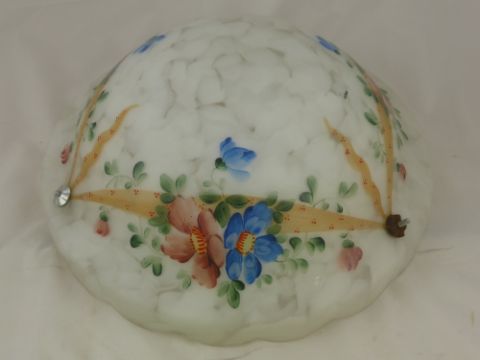 Three 1930's Opaque Glass Ceiling Shades, one being hand painted with flowers.