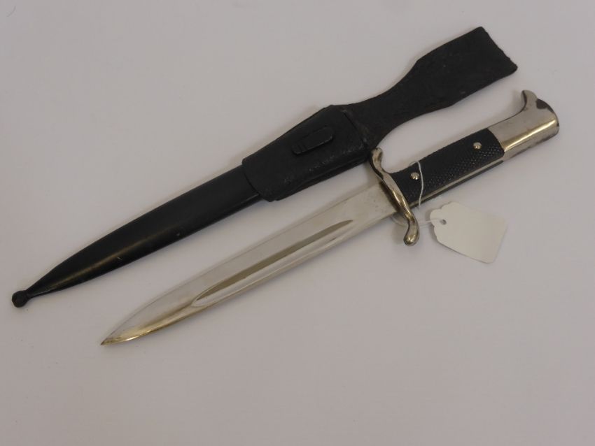 A WW2 German Fireman's Dress Bayonet with original scabbard and leather frog circa 1930, approx 37 cms long.