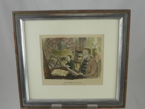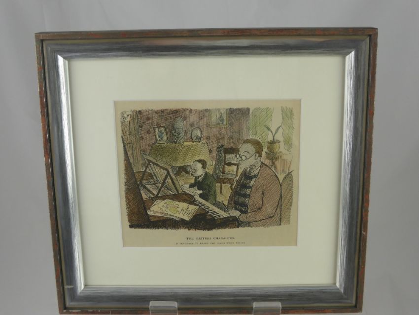 A Graham Laidler (Pont), hand coloured wood engraving entitled "The British character - a tendency to learn the piano when young" 1936 together with one other entitled "The British character - a keen curiosity about the future" 1936, framed and glazed approx 17 x 14 cms.