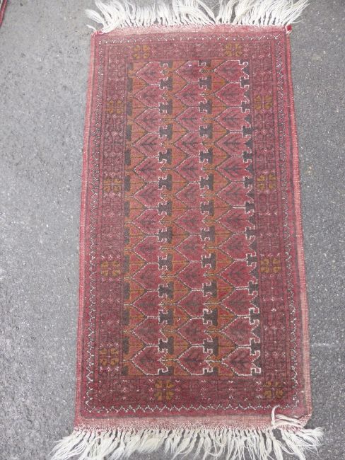 A Vintage Middle Eastern Woollen Rug, of floral design with floral border, approx 110 x 160 cms, together with two small Middle Eastern woollen carpets, approx 130 x 74 and 104 x 54 cms.