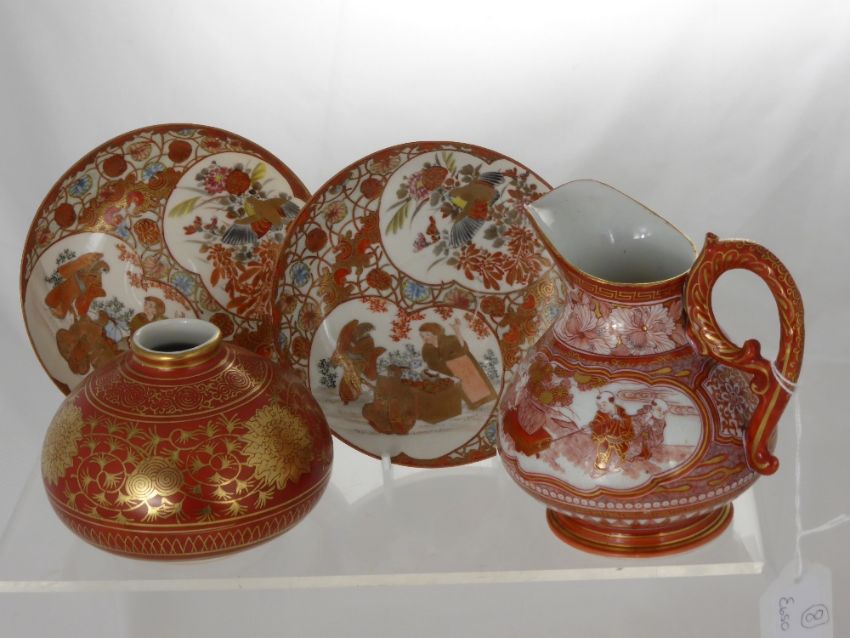 A Miscellaneous Collection of Japanese Porcelain, including hand painted bowl having gilded finish depicting wise men, character marks to surround and base, jug, two saucers and conical vase, bon bon dish with impressed mark to base. ((6)