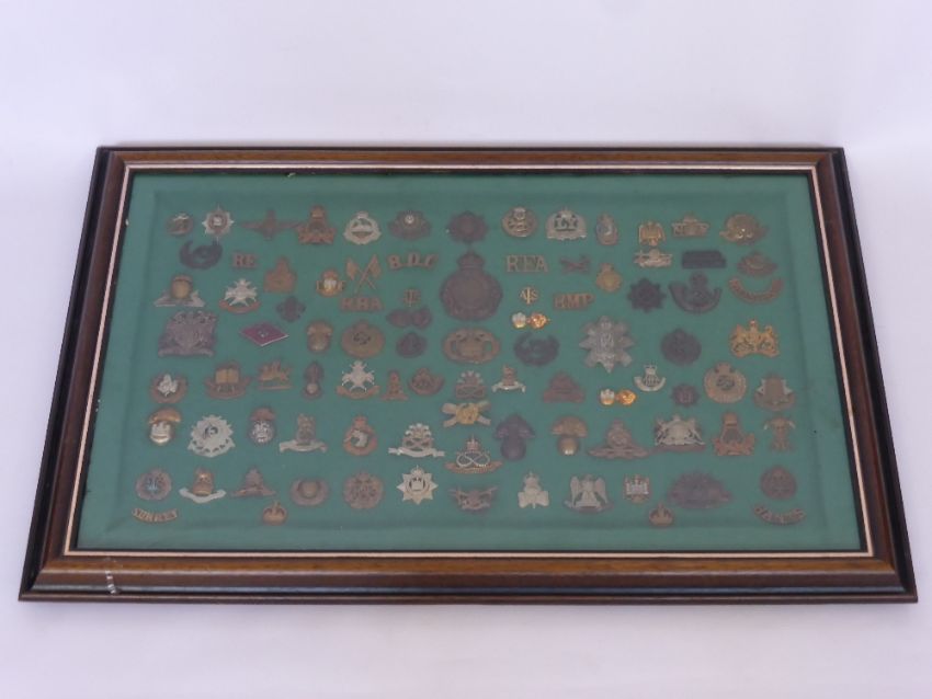A Framed Display of Military Badges, approx 100 items, including Royal Flying Corps, Manchester Reg. Scots Greys, Black Watch etc.