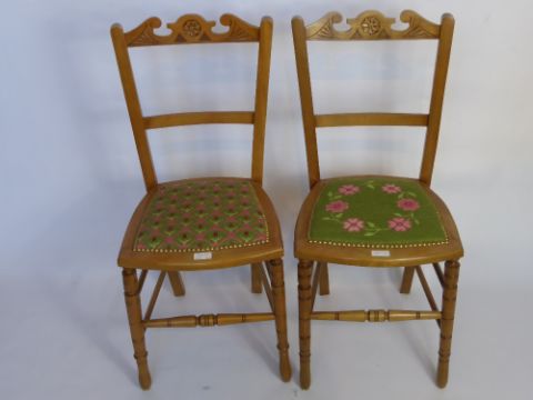 Two Oak Edwardian Bedroom Chairs, decorated chair backs, turned legs and stretchers. Tapestry seats depicting pink roses and tulips, approx 90 cms high.