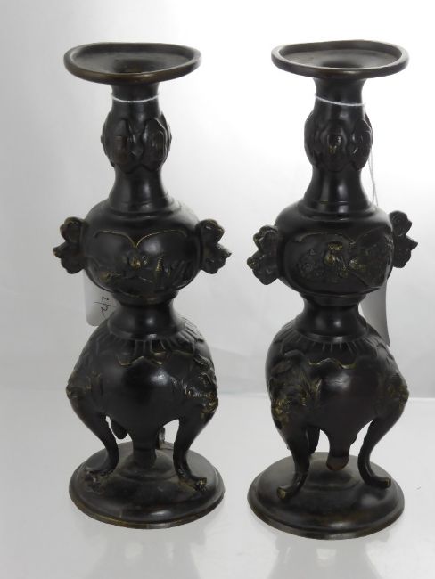 A Pair of Antique Japanese Bronzed Candle Sticks, the candle sticks having three lion mask feet, approx 21 cms high.