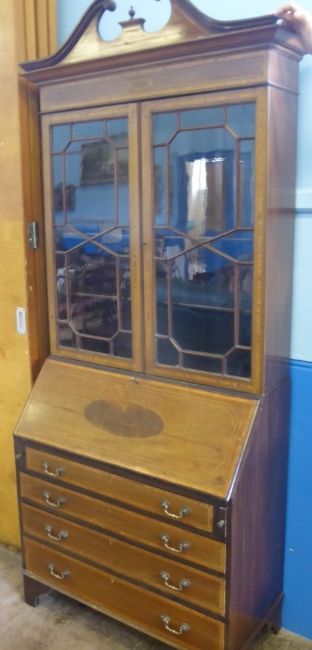 A Georgian Style Edwardian drop front secretaire book case, the book case having inlay to front with astral glaze doors and having four graduated drawers on bracket feet, approx 102 x 47 x 205 cms.